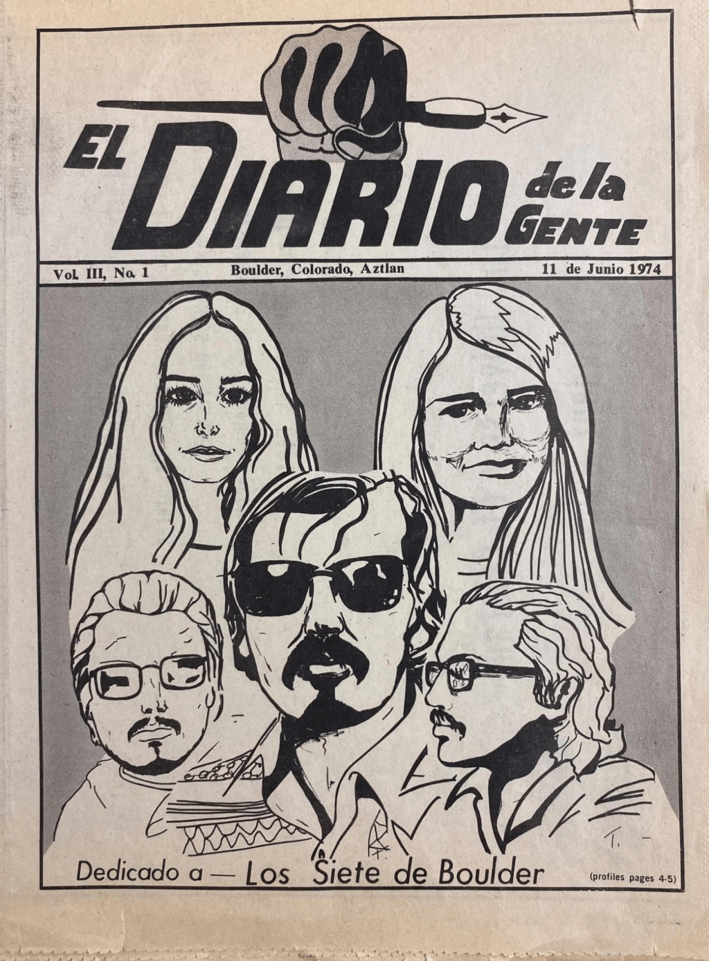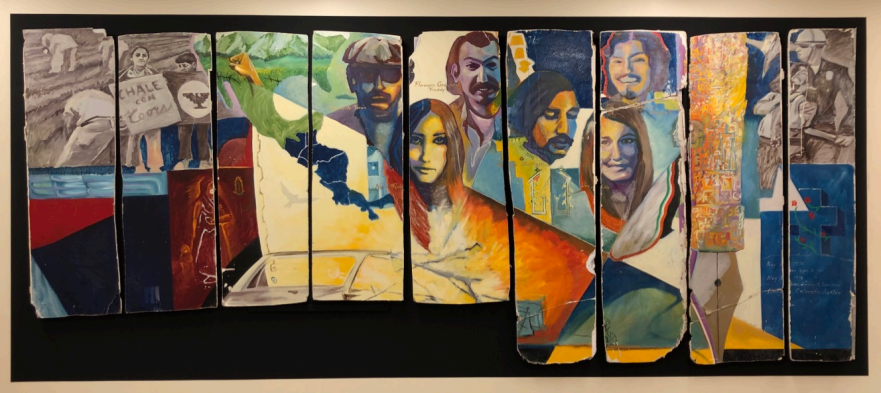 Mural of Los Seis de Boulder was painted by Pedro Romero on a wall inside the UMAS office in CU’s UMC. It was removed during a reconfiguration of the offices and taken in pieces to Pueblo by Freddy “Freak” Trujillo. It has now been installed at Pueblo Community Collge as part o the El Movimiento de Colorado y Pueblo exhibit in the library