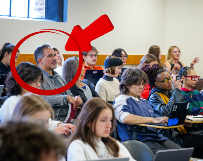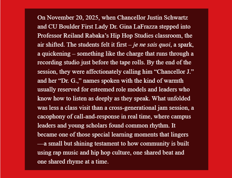 Chancellor Justin Schwartz is down with the kids—not in that kind of way, of course, he would never… and recently visited Dr. Reiland Rabaka’s hip hop studies class and was pictured intently participating in class discussion.